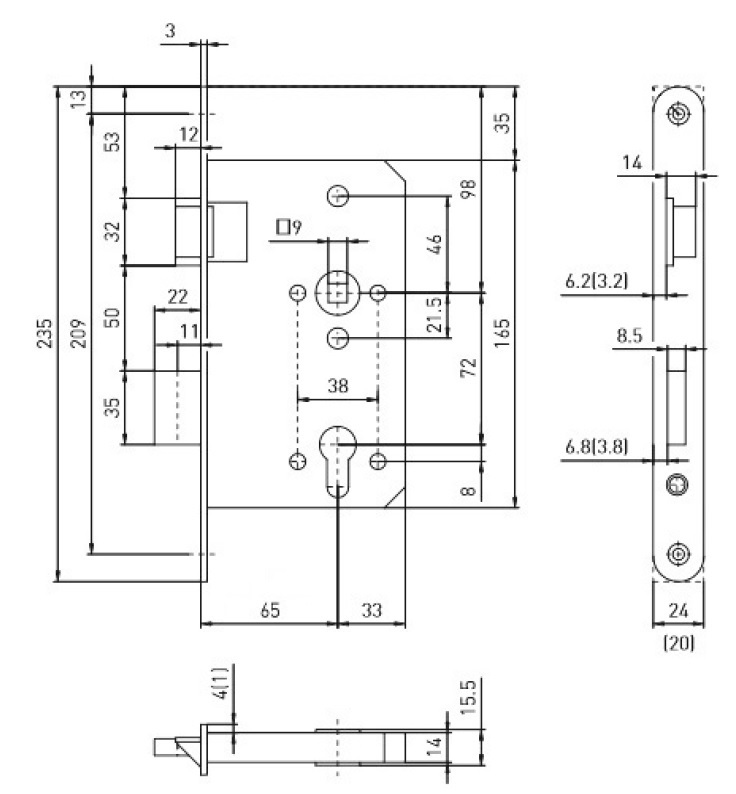 Kování a doplňkový materiál Dveřní kliky, závěsy, zámky Zámky TWIN Dveřní zámek BMH 1000 PZW/65/72/20/0/9 P