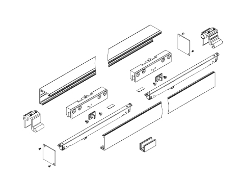Sada kování pro jedny dveře včetně horního vedení a krycí lišty. Verze bez tlumení. Povrchová úprava - eloxovaný hliník, barva nerez.