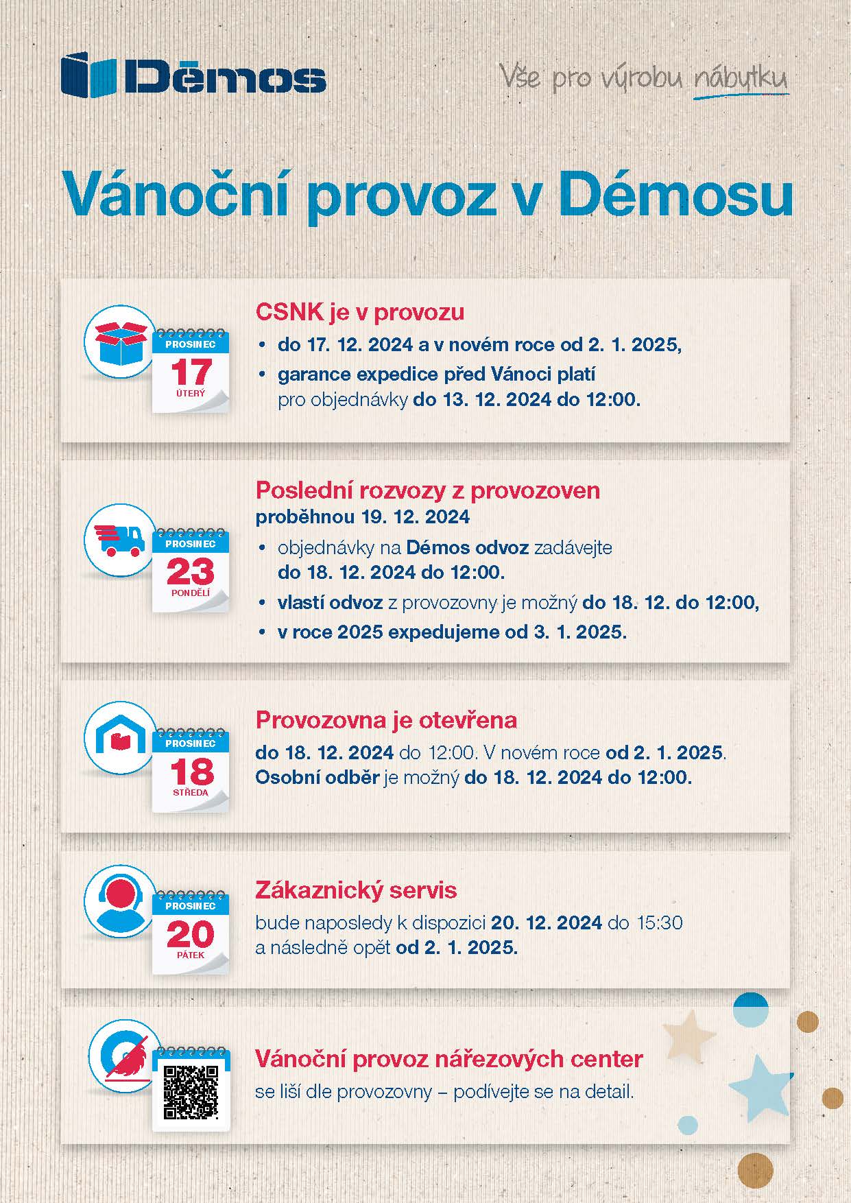 Objednávky můžete v době uzavření centrálního skladu, zákaznického servisu i prodejen zadávat online přes náš portál Démos24Plus s expedicí od 5. 1. 2024.