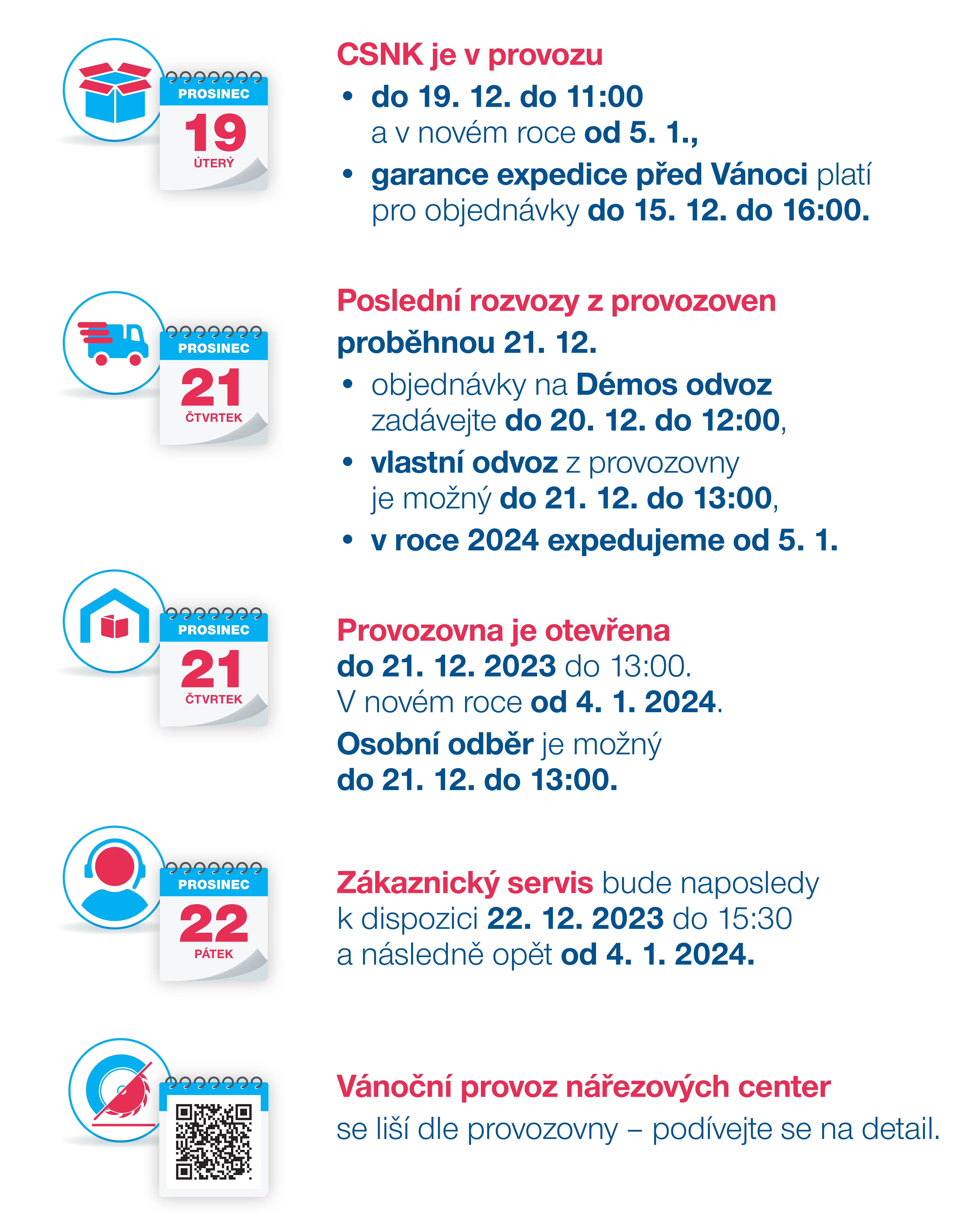 Objednávky můžete v době uzavření centrálního skladu, zákaznického servisu i prodejen zadávat online přes náš portál Démos24Plus s expedicí od 5. 1. 2024.
