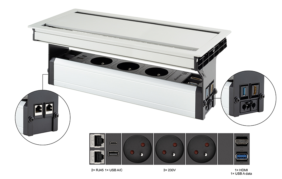 VersaFlap dual 2.0 elektrická zásuvka 3x 230V FR RJ45 HDMI USB A/C + data hliník