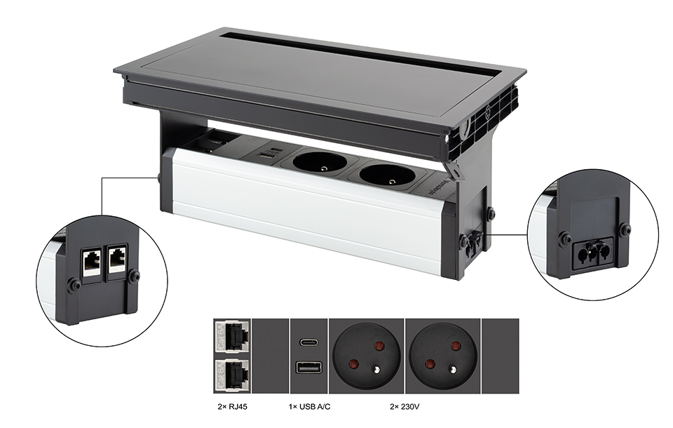 VersaFlap Mono 2.0 elektrická zásuvka 2x 230V, FR, RJ45, USB A/C, černá matná