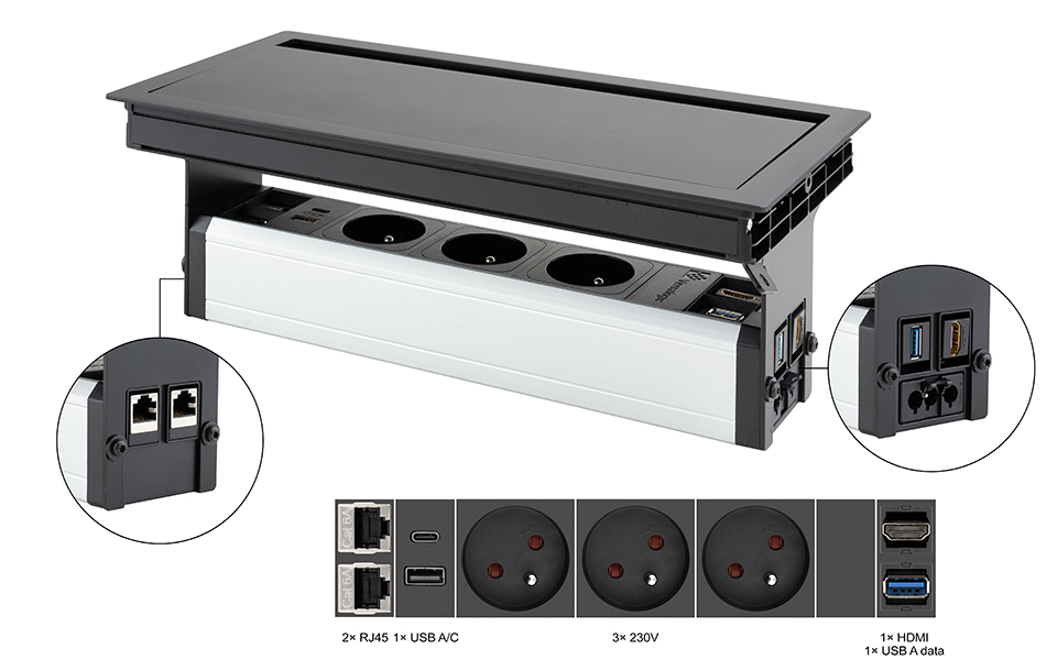 VersaFlap Mono 2.0 elektrická zásuvka 3x 230V, FR RJ45 HDMI USB A/C + data černá
