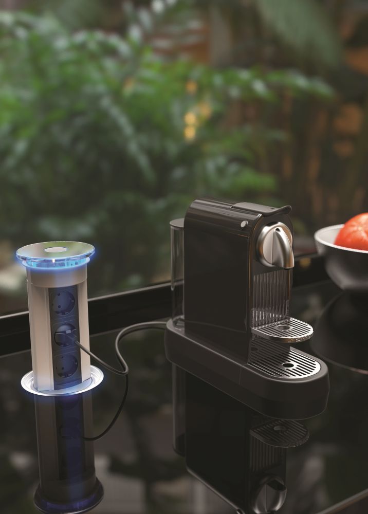 Výsuvný systém zásuvek s led podsvícením v modré barvě. Systém je vybaven 3 el. zásuvkami (FR verze s kolíkem) a USB power systémem, určeným pro nabíjení (např. mobilní telefon).