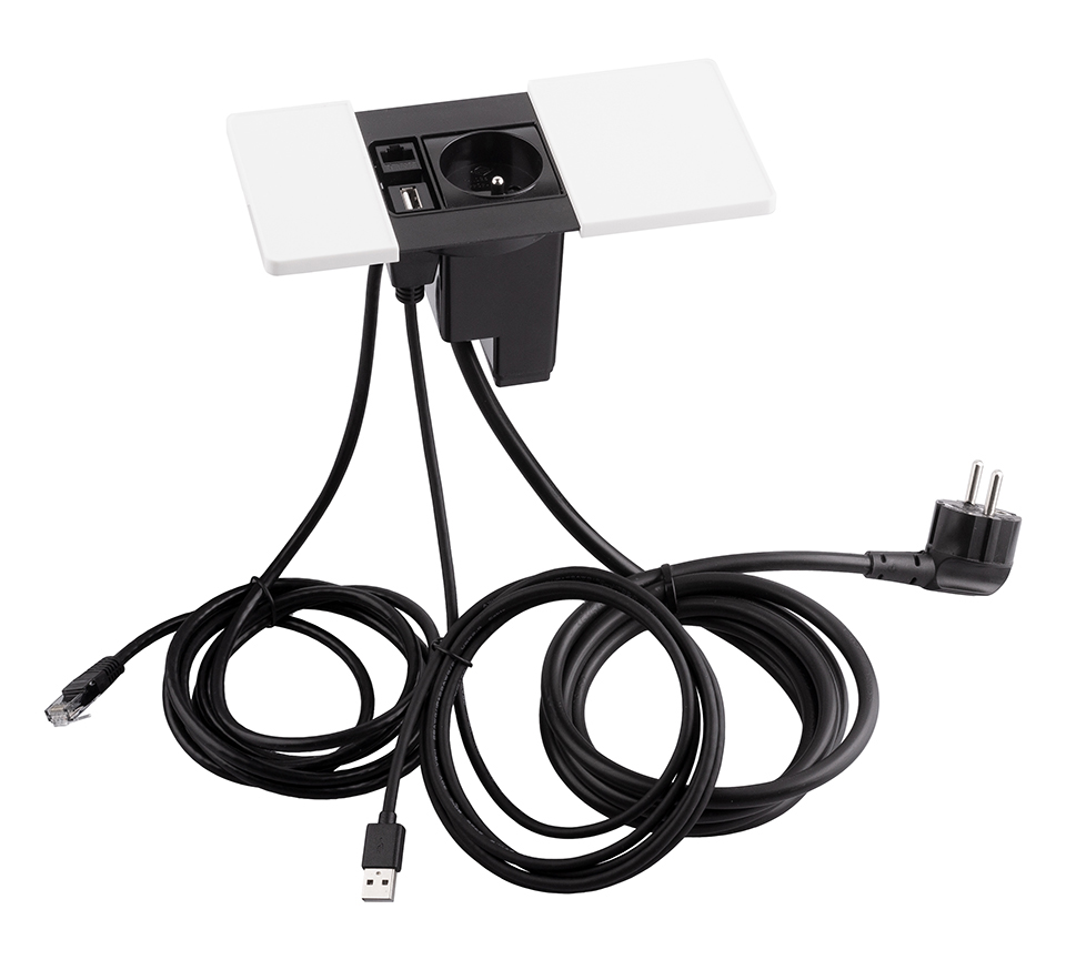 Systém pro zabudování do stolové desky kanceláří. Systém je vybaven 1 el. zásuvkou (FR verze s kolíkem), 1 USB propojením a jedním datovým portem RJ45.