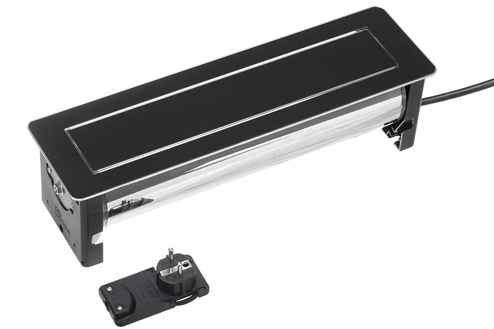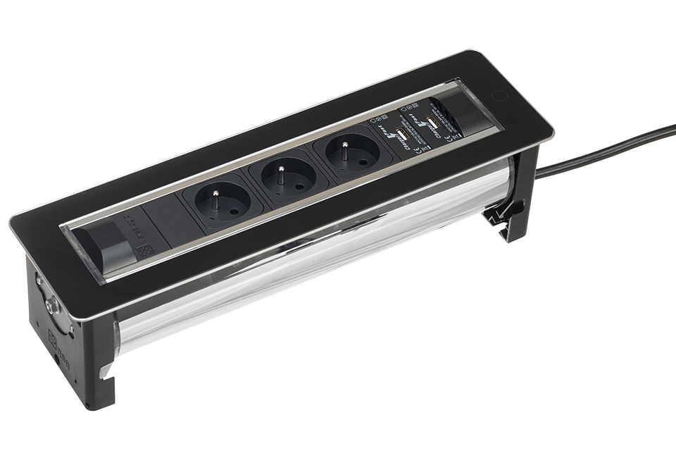 Versaturn je elektronicky řízená moderní designová zásuvka určená pro zabudování do stolů v kancelářích, zasedacích místností nebo hotelích.