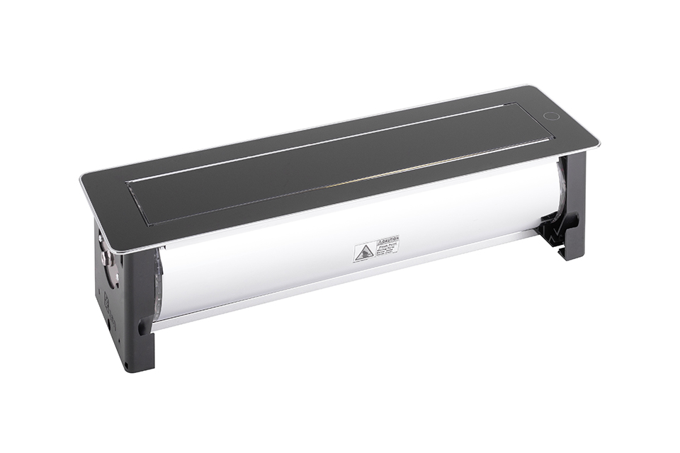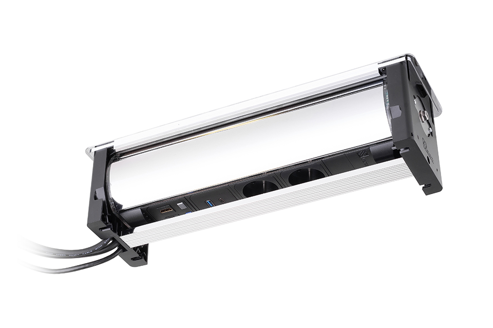 Versaturn je elektronicky řízená moderní designová zásuvka určená pro zabudování do stolů v kancelářích, zasedacích místností nebo hotelích.