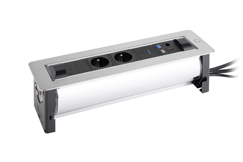 Versaturn je elektronicky řízená moderní designová zásuvka určená pro zabudování do stolů v kancelářích, zasedacích místností nebo hotelích.