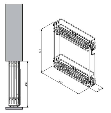 Drátěný koš se dvěma policemi pro skříňku 150mm s HPL bílým dnem. Boční plnovýsuv s dotlumením (Hettich) pro montáž na levou stěnu korpusu. Rozměry: h473xv510xš107. Nosnost 30kg.