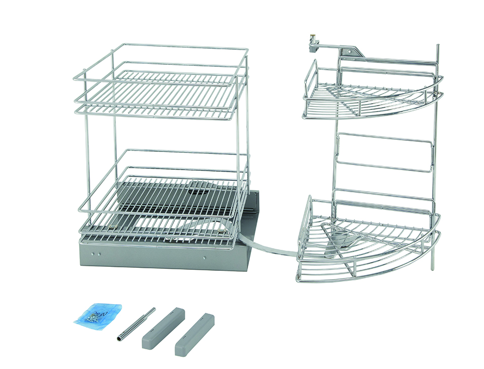 Výsuvný koš pro rohový korpus s možností vnitřní koše vysunout z kospusu pomocí kuličkových celovýsuvů. Pravo-levá varinta. Minimální rozměr koprusu 900mm (dvířko - 450mm).