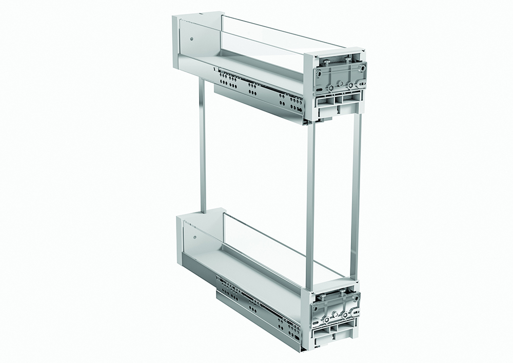 Koše pro 150mm korpus s čirými SKLENĚNÝMI bočnicemi. Barva držáků a rámu šedá. Celovýsuv s dotlumením při zavírání. Nastavení čela ve 3 směrech. Montáž na levou stěnu.