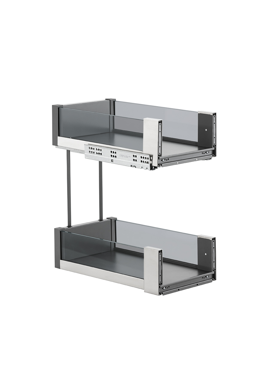 Dvojkoš z řady Esence s bočním vedením (výsuv vlevo i vpravo) pro 400 mm korpus. Bočnice s kouřovými skly v hliníkovém rámečku s plným dnem. Kovové a plastové části v šedé barvě. Originální design výrobku pro moderní nábytek. V balení včetně čelního uchycení s nastavením čela ve třech směrech.