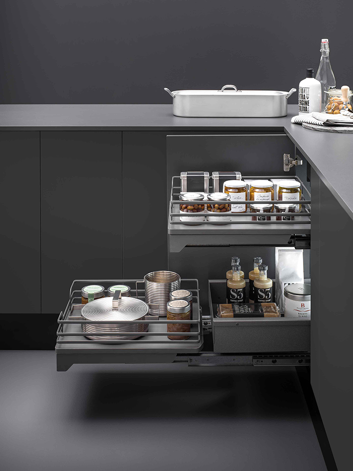 Sada složená ze 4 tmavě šedých výsuvných polic pro mechanismus Fly Box.