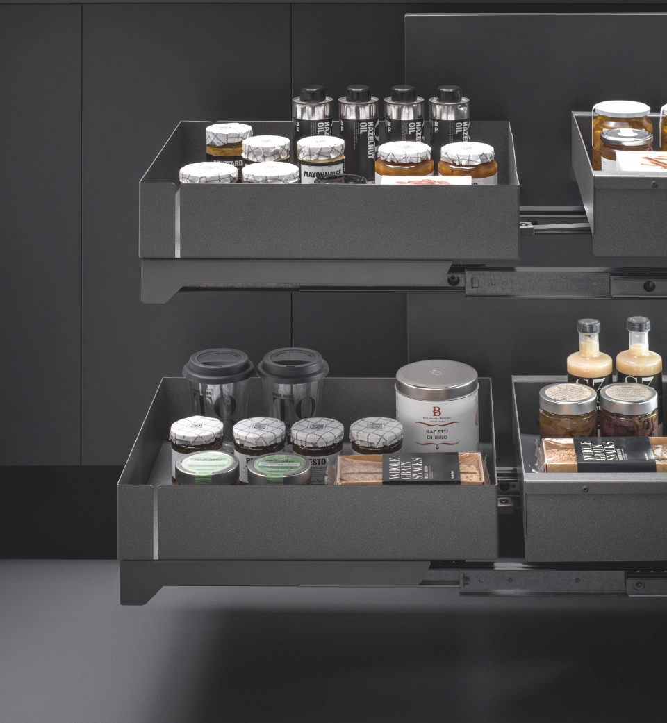 Sada košů pro mechanismus Fly Box. Sada obsahuje 2 celovýsuvné police s nezávislým pohybem, které lze namontovat na pravou i levou stranu. Součástí jsou 2 vnitřní a 2 přední koše s pevnou základnou a okrajem - typ Lamina.
