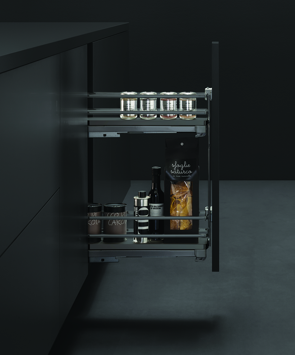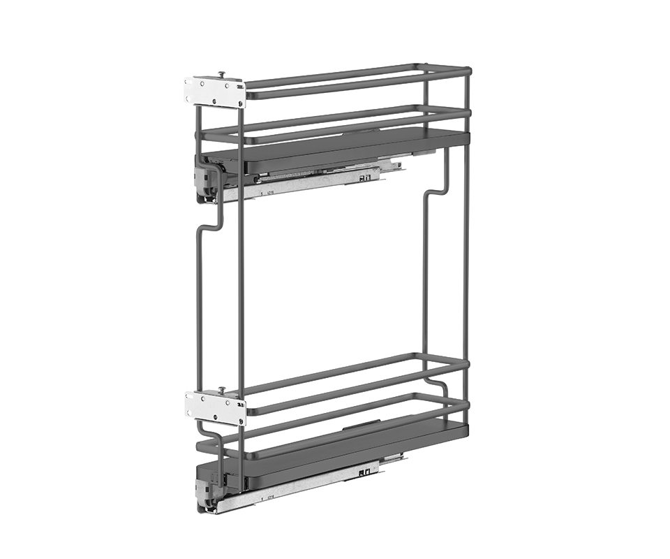 Boční dvojkoš z řady Galaxy pro 150 mm korpus. Oválný drát, antracit s plným dnem. Montáž na levou stranu korpusu. V balení včetně čelního uchycení s nastavením čela ve třech směrech. Skrytý celovýsuv s tlumením