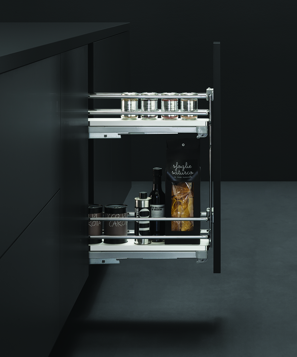 Boční dvojkoš z řady Galaxy pro 150 mm korpus. Oválný pochromovaný drát s bílým plným dnem. Montáž na pravou stranu korpusu. V balení včetně čelního uchycení s nastavením čela ve třech směrech. Skrytý celovýsuv s tlumením