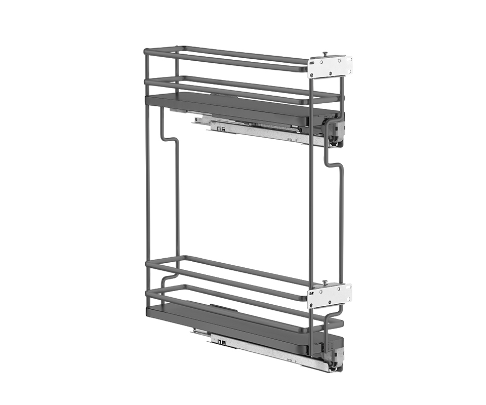 Boční dvojkoš z řady Galaxy pro 200 mm korpus. Oválný drát, antracit, s plným dnem. Montáž na pravou stranu korpusu. V balení včetně čelního uchycení s nastavením čela ve třech směrech. Skrytý celovýsuv s tlumením