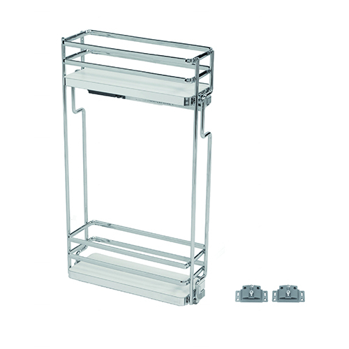 Mělký boční dvojkoš z řady Galaxy do horních, případně koupelnových skříněk. Pro šířku korpusu 150 mm a minimální čistou hloubku 300mm. Oválný pochromovaný drát s bílým plným dnem. Montáž na levou stranu korpusu. V balení včetně čelního uchycení s nastavením čela ve třech směrech. Skrytý celovýsuv s tlumením