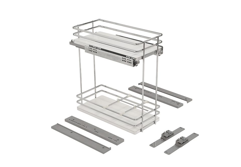 Dvojkoš z řady Galaxy s bočním vedením (výsuv vlevo i vpravo) pro 400 mm korpus. Oválný pochromovaný drát s bílým plným dnem. V balení včetně čelního uchycení s nastavením čela ve třech směrech.