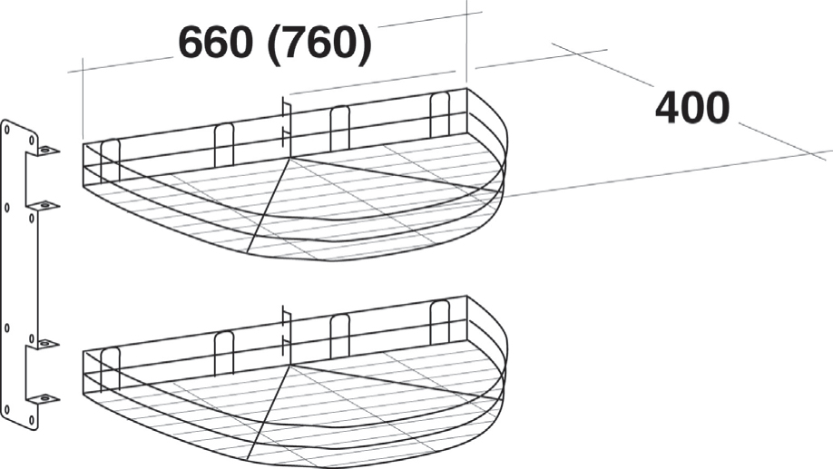 Výrobek umožňuje lepší využití prostoru rohových skříní kuchyňského nábytku. Provedení chrom. Obsahuje dva půlkruhové koše, přípravek k jejich zavěšení, plastovou úchytku spodního koše, 2x vrut. Šířka: 760 mm