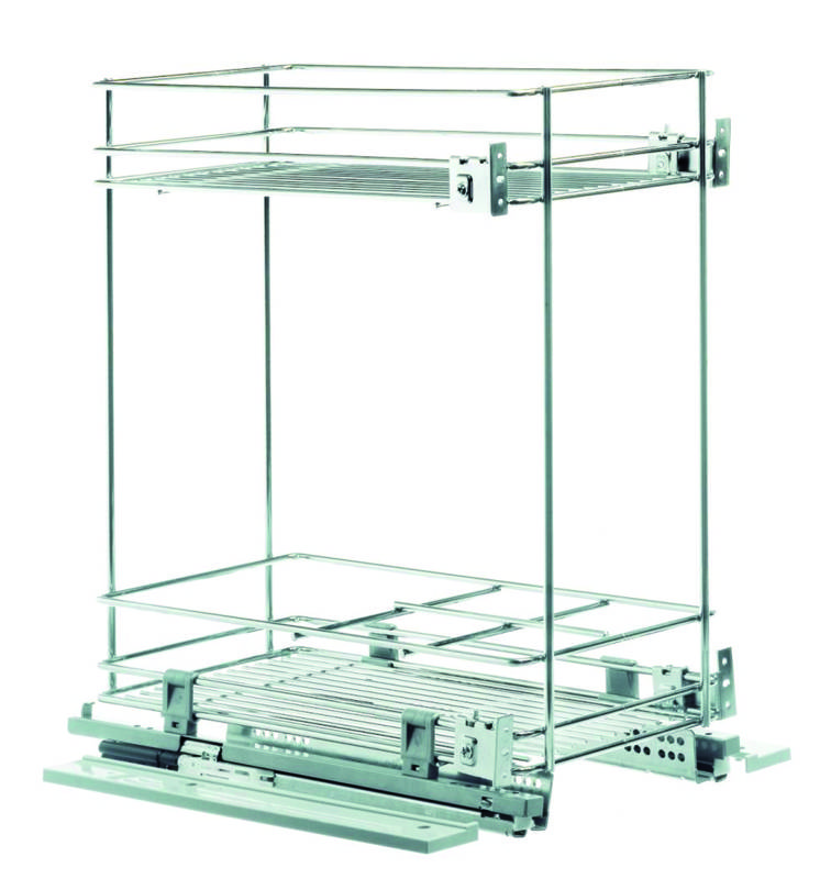 Drátěný koš se dvěma policemi pro skříňku 400mm. Plnovýsuv s dotlumením (Hettich) pravolevý. Rozměry: h470xv520xš364. Balení obsahuje i 4 ks držáků čela