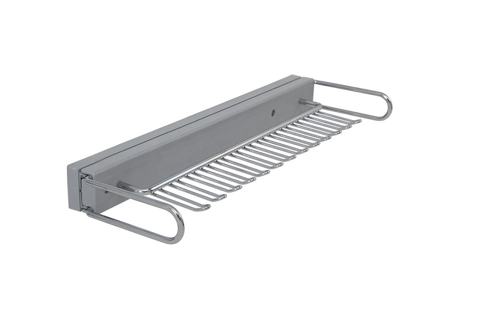 Výsuvný věšák na pásky a kravaty. Kuličkový celovýsuv s dotahem (bez tlumení). Rozměry: 165x500x50 mm. Barva: hliník/chrom.