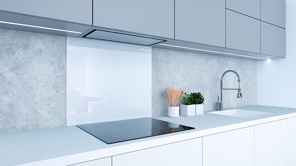 Sporáková zástěna - skleněný obklad v provedení bílá RAL 9003, z kaleného skla o tloušťce 5 mm.
