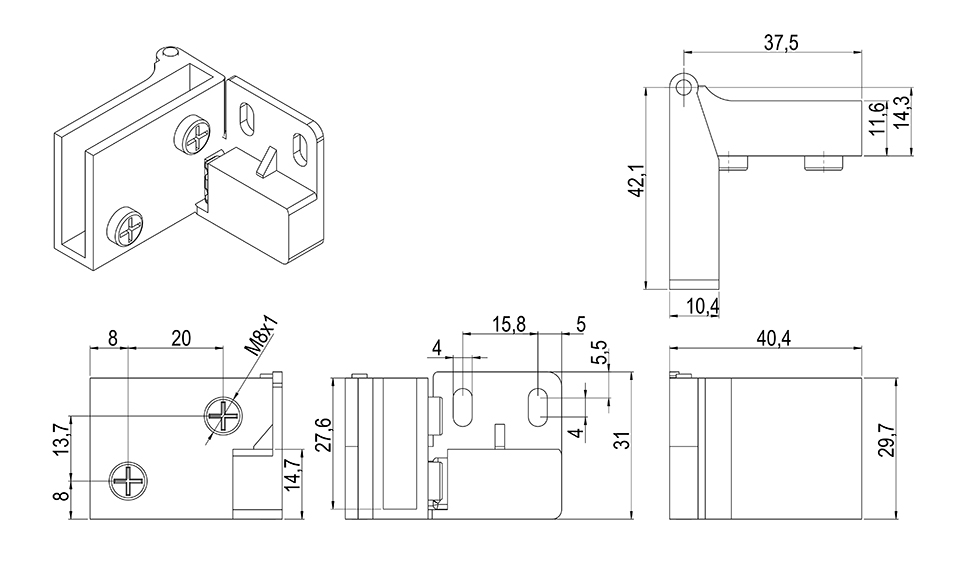 Pro tloušťku skla do 5mm. Uchycení skla dvěma diagonálně umístěnými šrouby. Při plném vsunutí skla do závěsu je odstup okraje skla od kraje závěsu (bočnice korpusu) 2mm a od spodní hrany závěsu (dna korpusu) 2,2mm.